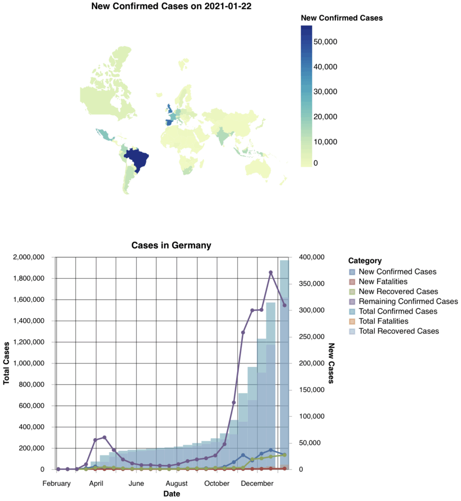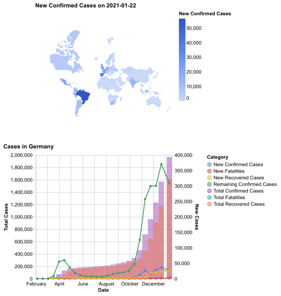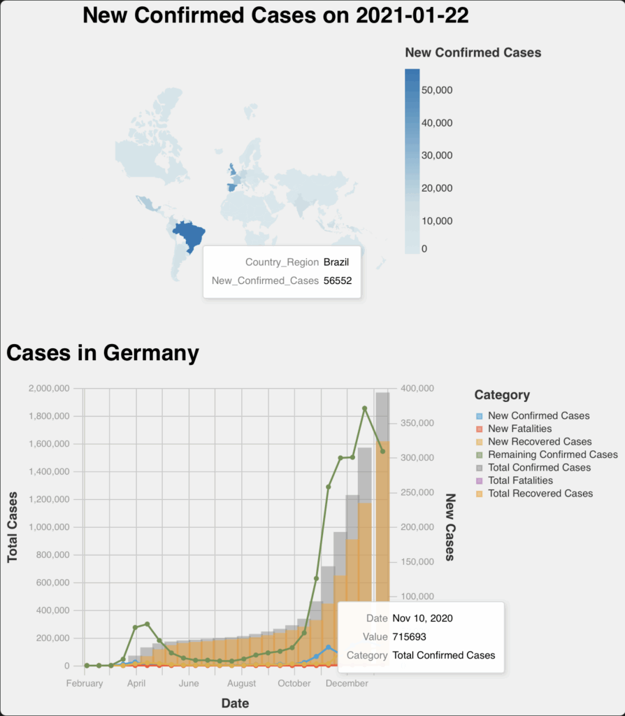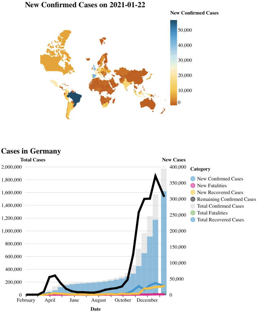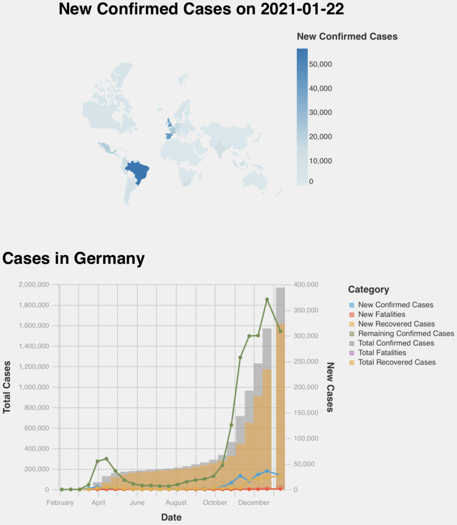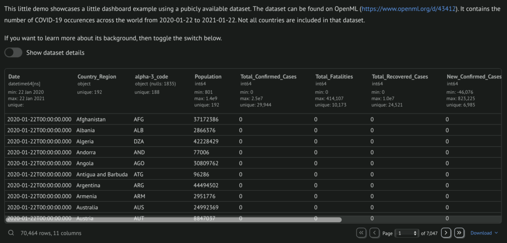 In der COVID-19 Web-App werden publizierte COVID-19-Daten von OpenML geladen und visualisiert. Die Anwendung enthält einen rudimentären Dateninspektor, ein paar Kontrollelemente zum Filtern und eine interaktive Weltkarte mit gemeldeten Fällen, Fatalitäten und anderen Zahlen.